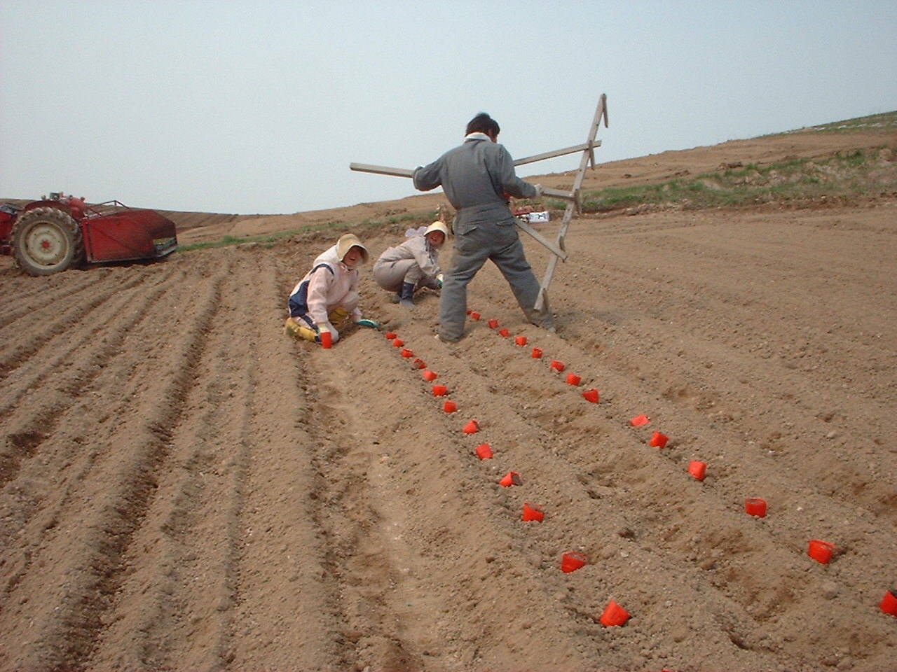 農作物の苗植え じゃかいも、とうもろこしの苗を手作業で植えていきます。